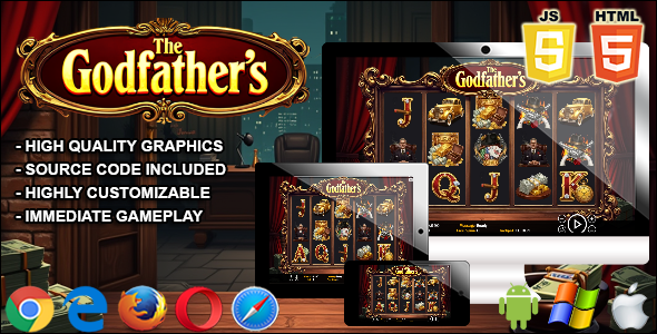 The Godfathers is a HTML5 Slot Machine (Casino game). This game has been developed in PHP / HTML5 / JavaScript and Phaser 3 with the HTML5 Slotbuilder – a no-code tool to build custom slots without programming! Features: • Audio / Musik on off • Fullscreen • Multilanguage Support (German, English, Spanish, French, Portuguese, Russian, Chinese, Hindi, Arabic, Bengali, Urdu, Indonesian, Japanese) • Multiple Resolutions: (low: 640×360 / middle: 1280×720 / high: 1920×1080) • Autoplay • 10 Winlines • Jackpot • Wild • Freegames Created with the HTML5 Slotbuilder – the easiest way to build custom slot games! The ZIP package contains the game with multiple resolution (low: 640×360 / middle: 1280×720 / high: 1920×1080) that scales to fit the current screen device. The game is fully compatible with all most common mobile devices and browsers. Easy Installation The ZIP package contains the game with multiple resolution (low: 640×360 / middle: 1280×720 / high: 1920×1080) that scales to fit the current screen device. Simply upload to your Server Compatibility Fully compatible with most servers, however always good to check with your admin team or host company. Naturally achieving 100% compatibility across every device screen size is very difficult, but all games created are tested on the most common of all web browsers and devices including Chrome, Firefox, Safari and Opera, tablets, laptops, iPhone and Android devices. Technical Details This game has been developed in PHP / HTML5 / JavaScript and third-party library Phaser 3 http://phaser.io/ with the HTML5 Slotbuilder For further technical info please read the documentation(Only For Premium Category Products !)