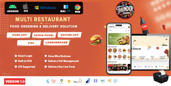 ThunderFood – Multi Restaurant Food Ordering & Delivery Solution (User, Driver, Admin, POS)