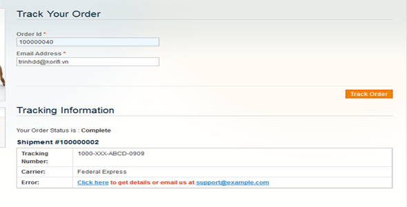 Our “Track Order” Extension allows the buyers to check the status of their orders without logging in to their account. Customer can also check the tracking information of shipment using this extension. A link called “Track Order” will be automatically inserted in the header part of the site. The customer (buyer) will simply have to fill the order number and email address, and they will be shown the order status with all its details including the shipment tracking information. The details will include links to shipment provider’s site to track order directly.Key Features