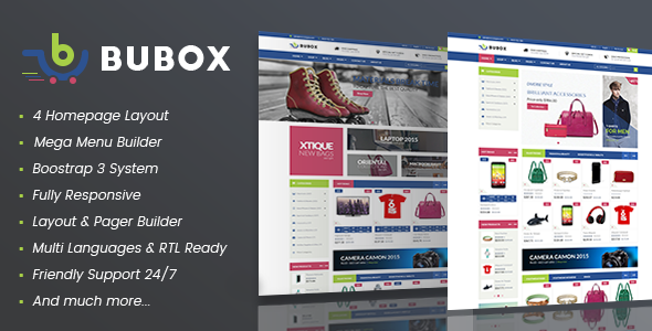 Looking for a Vina Bubox great and professional designed store template? Vina Bubox is a perfect Joomla Template for your shopping business. This template combines the best elements of ecommerce – VirtueMart 3 and the best template framework – Helix 3 for a impressive new idea for promoting your business. Its an ideal template for building sites that specialize in selling clothing and accessories. It is fully responsive and easy to configure and even comes with 4 predefined home page and 3 presets color options. With purpose is increasing sales for fashion online store, we added some outstanding features such as ajax shopping cart, ajax wishlist, products carousel, latest posts carousel. Mega Menu with many columns under each product categories takes customers to everywhere in your fashion store. Product Tabs Slider shows types of products in each tab such as top rated, best selling, new, featured. Check it out! Fully compatible with Joomla 3.5 / 3.6+ and VirtueMart 3.0.9 / 3.0.18+ Main Features:- 4 Predefined home page layouts