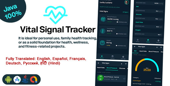 Vital Signs Tracker is a modern and complete Android application for monitoring vital health data, developed 100% in Java, compatible with Android SDK 29 up to 36, and built following best practices such as MVVM architecture, Room Database, and LiveData. It is ideal for personal use, family health tracking, or as a solid foundation for health, wellness, and fitness-related projects. Important Medical Disclaimer / Legal Notice This application (VitalSignals / Vital Signs Tracker) is intended strictly for personal tracking, record-keeping, and general wellness purposes only. This application is NOT a medical device, and it does NOT provide medical advice, diagnosis, or treatment. The information collected or presented by the app is not a substitute for professional medical assessment, diagnosis, treatment, or consultation with a qualified healthcare professional. ALWAYS seek the advice of your physician or other qualified health provider with any questions you may have regarding a medical condition. Never disregard professional medical advice or delay in seeking it because of something you have read in this application or its description. Key Features- Vital signs recording and history